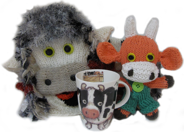Cow Lizzy Tea Cozy and Knitkinz Yellow Cow