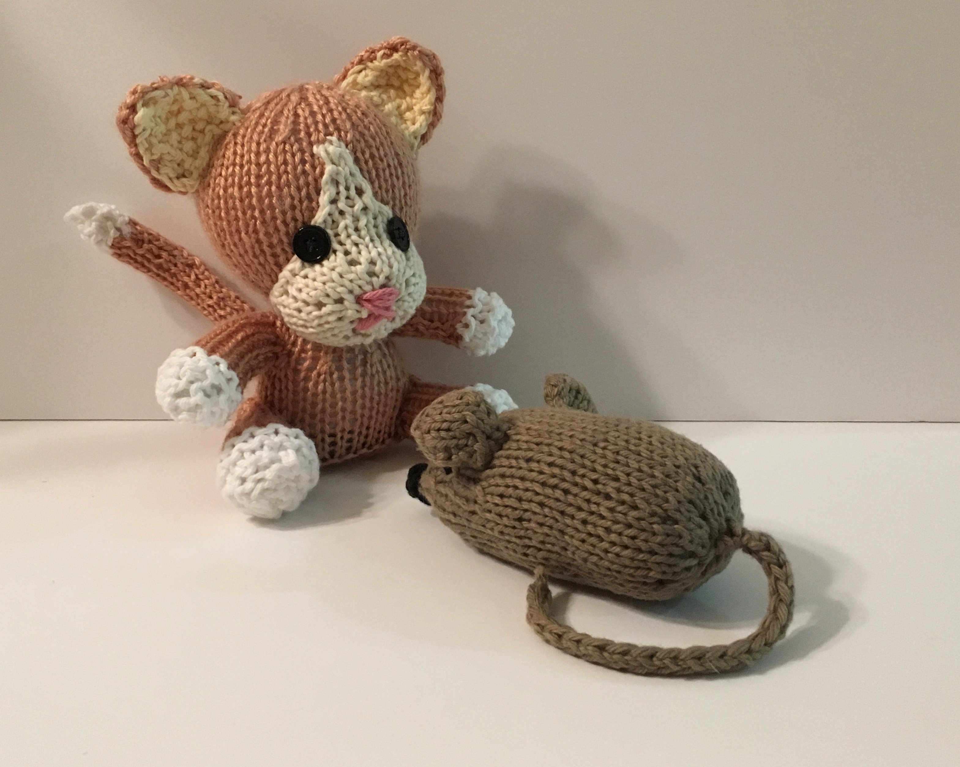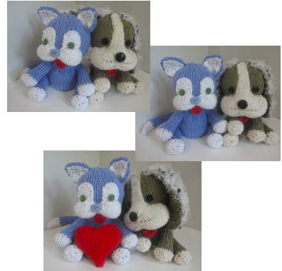 This 6” tall Knitkinz Office Cat and Dog can sit next to you in your office. They can keep pens or business cards for you. Or they can sit and look at your computer. Any Yarn can be used for your Cat and Dog. For Dog we used Grey and White Cotton Yarns and White Fun Fur for his ears. For Cat we used Blue and White Cotton Yarns. Also we used Red Cotton Yarn for their tongues. You can find the pattern for both Knitkinz Office Cat and Dog in Ravelry: Knitkinz Cat and Dog for Your Office $4.41Knitkinz Cat for Your Office