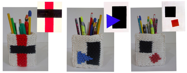 The Triangular Pen Holder size: Triangle Base Site = 4 inches and Height = 4.5 inches. Use Needles #3 and the following yarn: * White cotton yarn * Black cotton yarn * Blue cotton yarn * Red cotton yarn